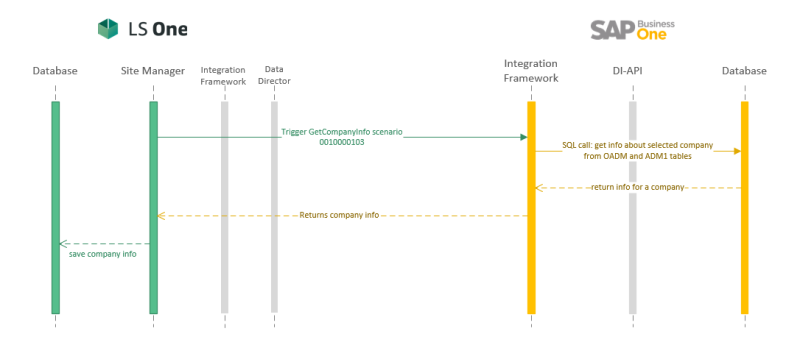 The GetCompanyInfo scenario retrieves the company information (name, address, phone number, currency code etc.) from SAP Business One and sends it through the LS One Integration Framework to the LS One company. If the currency code is changed following this process, all existing exchange rates are deleted and the ExchangeRatesSync scenario should be executed through the SyncData or SyncCurrencies job.
