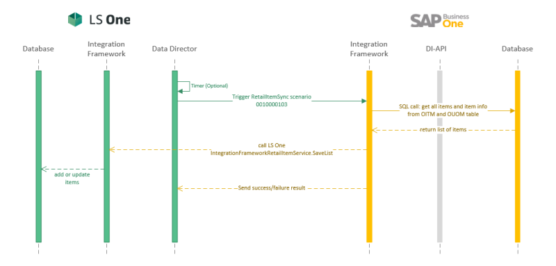 The RetailItemSync scenario retrieves item master data from SAP Business One, maps the items to LS One retail items and saves them to LS One.